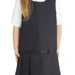 three-button front placket with dyed-to-match buttons, drop waist with pleated skirt.